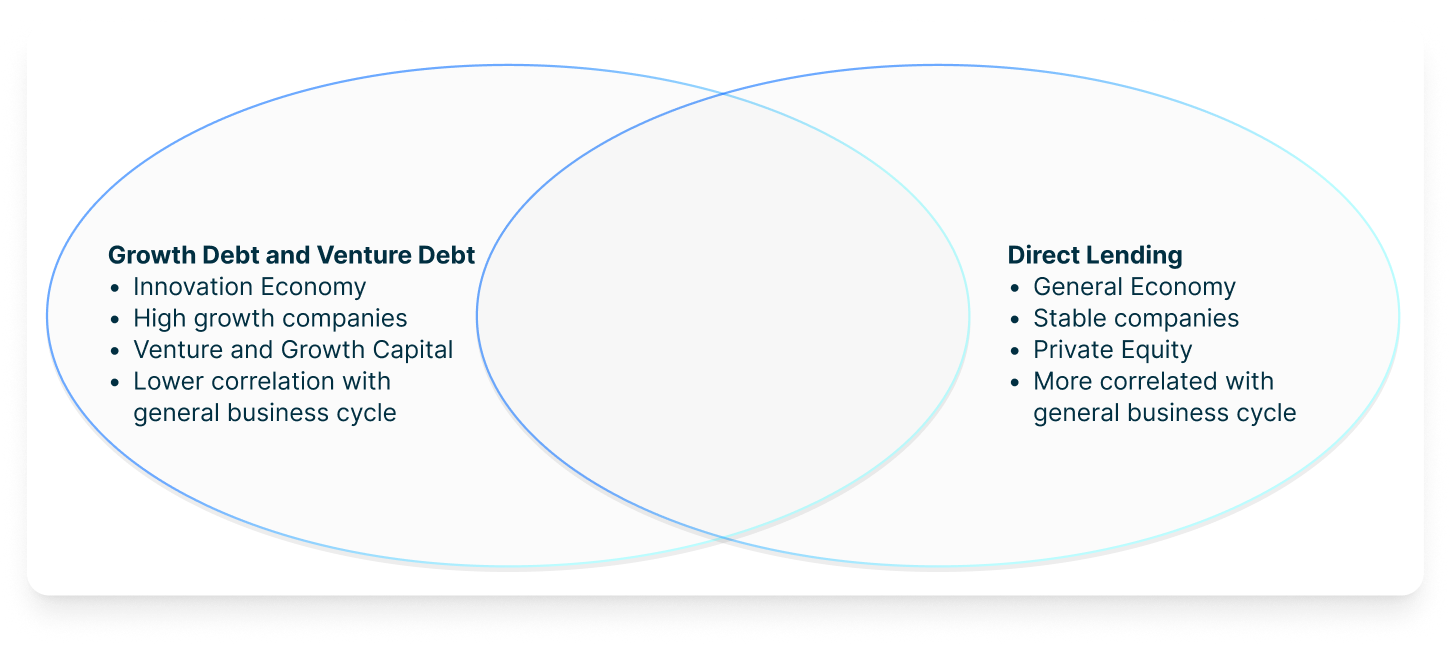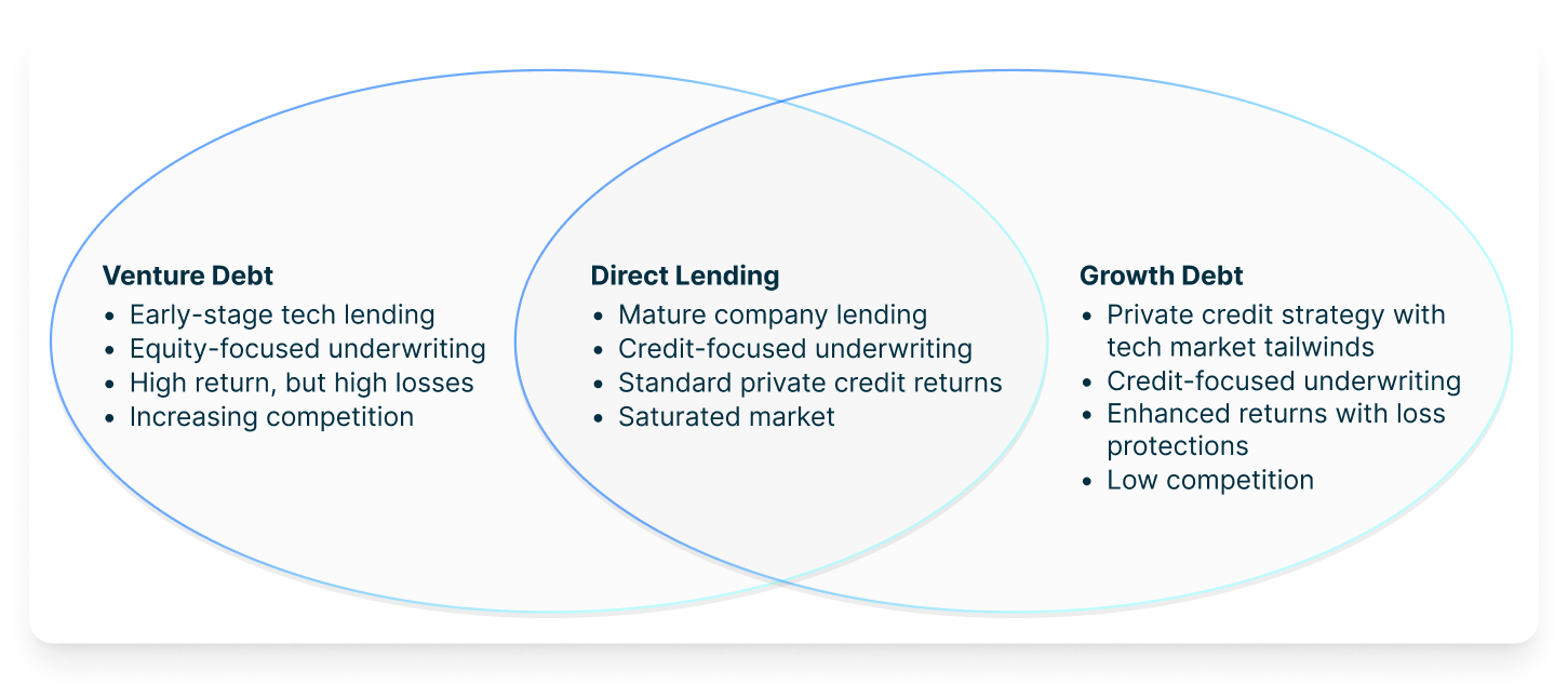 Direct lending, in contrast, focuses on stable, mature companies backed by private equity. However, a strategy is emerging that benefits from the more attractive aspects of venture and direct lending: growth lending, also known as growth debt.