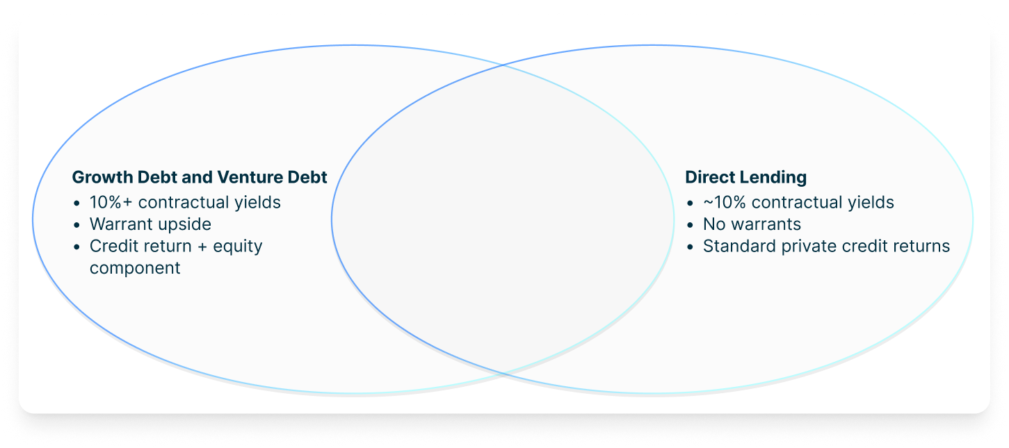 Both venture and growth lending cater to high-growth, typically cash-burning, companies that are continuing to invest in expansion. Accordingly, these strategies attract higher yields through higher coupons and greater alignment with the companies through equity upside, for example, with warrants.