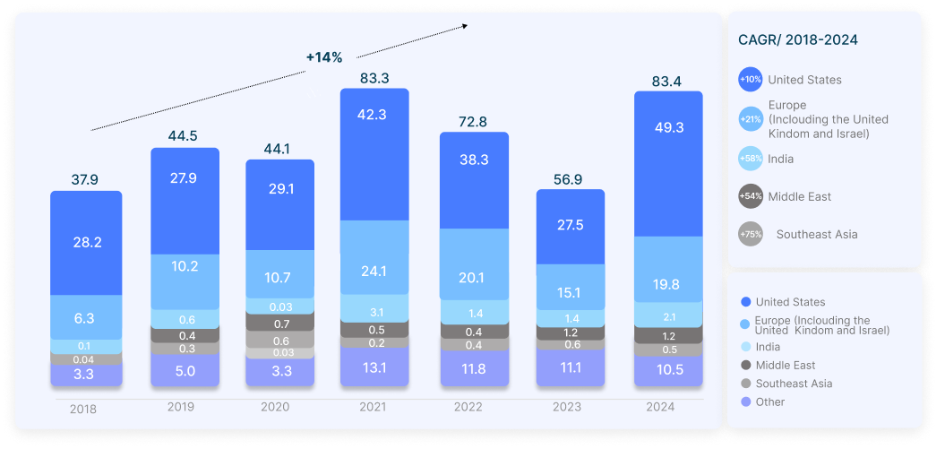 By 2025, overall funding levels held stable, but deal counts declined, resulting in a greater concentration of capital in fewer, larger rounds.²